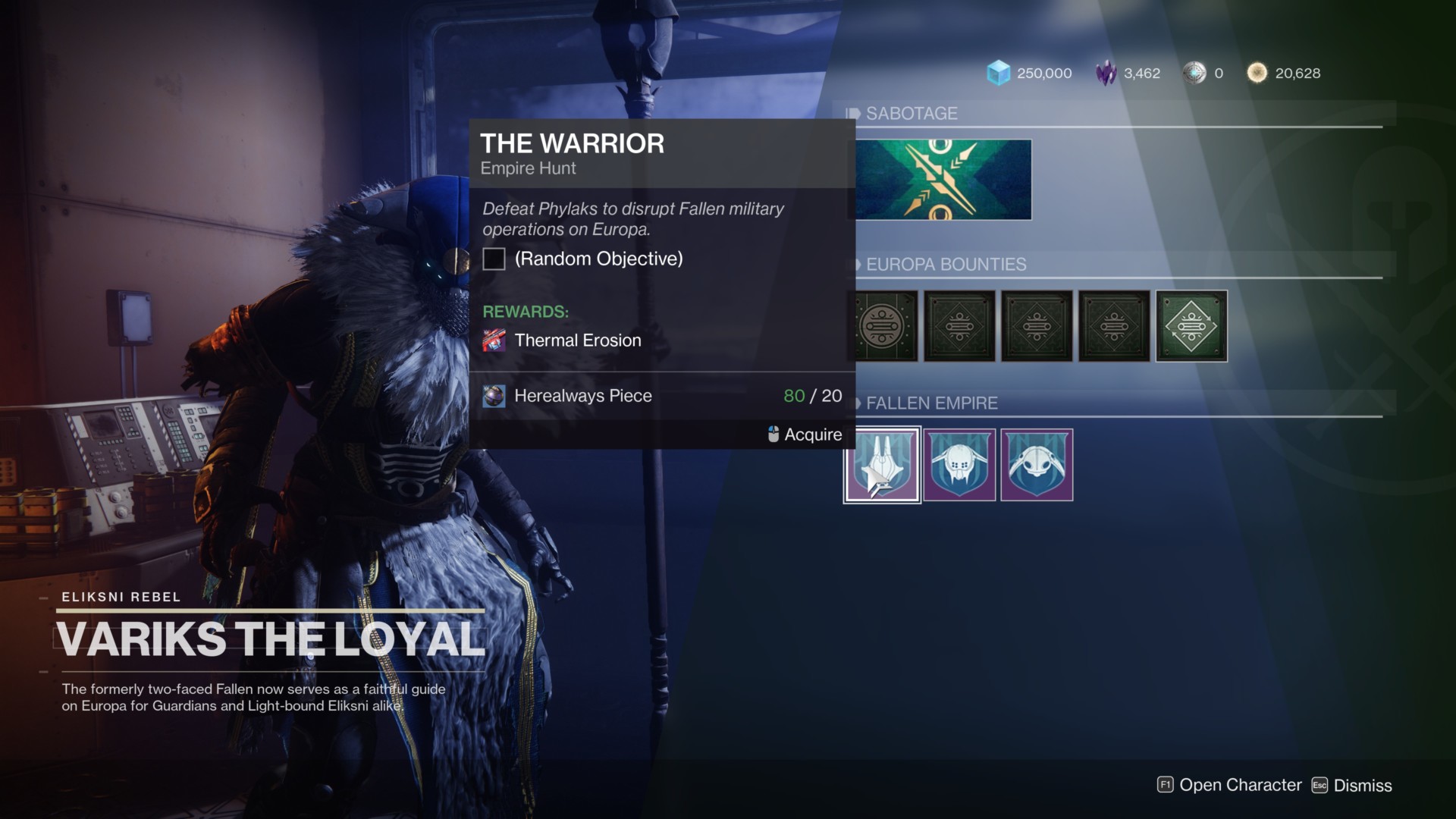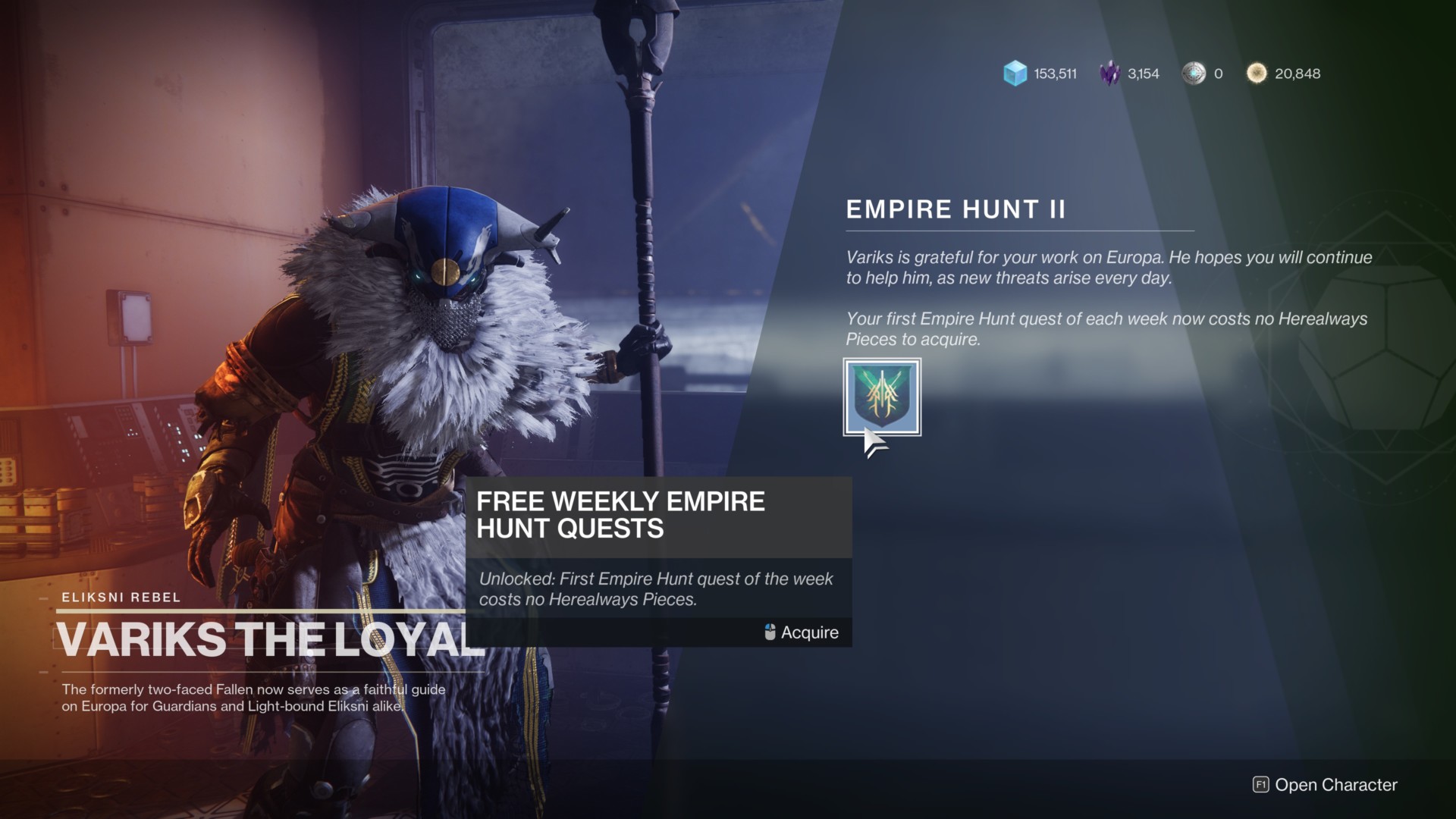 Likewise, keep in mind that Empire Hunts cost 40 Herealways Pieces by default. These resources are obtained whenever you complete patrols, lost sectors, and public events. Now, if you want to save a lot, grab the “Empire Hunt I” quest/perk from Variks to halve the cost. Later, you can also get “Empire Hunt II” to make the first activity free. As for the other perks and tasks related to Empire Hunts, these are time-gated and would become available in the coming weeks.