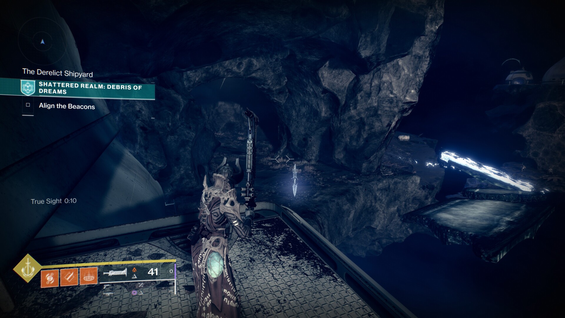 Go through the cavern in the Encampment that leads to the Derelict Shipyard. Before you reach the shipyard proper, you’ll see a True Sight totem. Use the platforms to grab the chest.