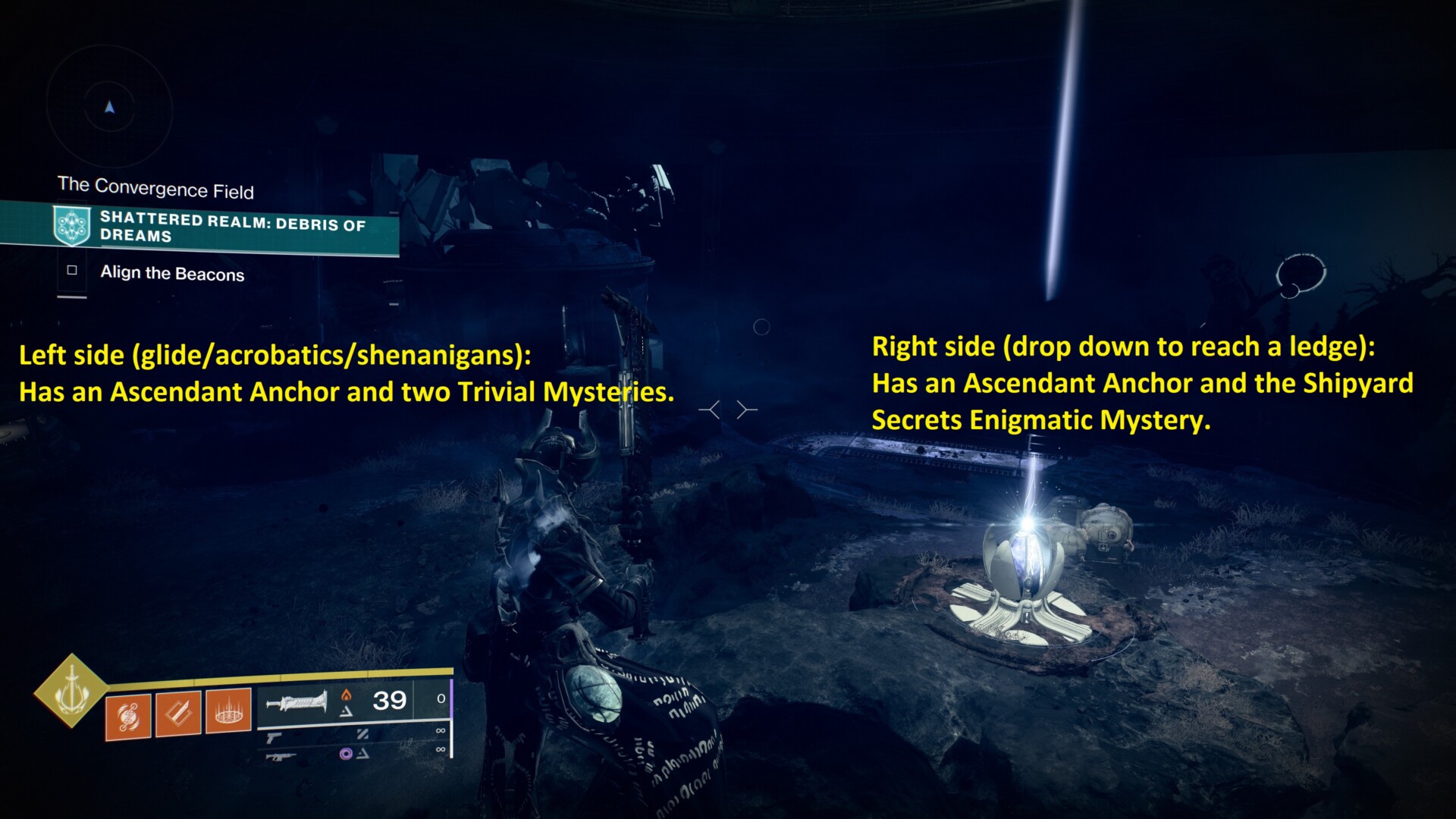 All right, that does it for the Enigmatic Mysteries and Trivial Mysteries in Destiny 2‘s Shattered Realm: Debris of Dreams. We’ll check back next week to see new collectibles and discoveries. Lastly, don’t forget to visit our Ascendant Anchors guide so you can grab additional Parallax Trajectory in this zone.