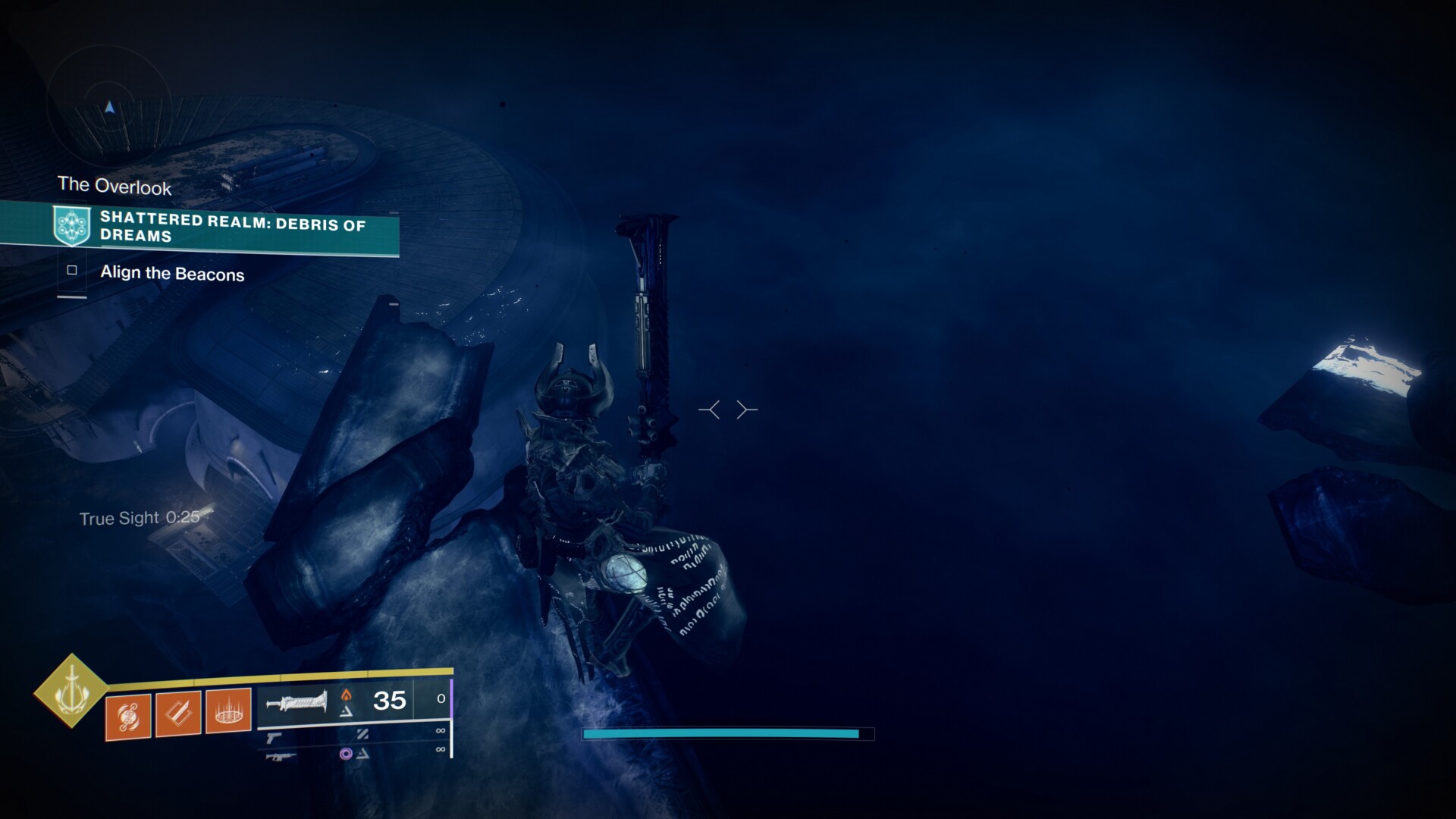 Go back to the Convergence Field area. This time, we’re going to take a look at the edge on the left-hand side. The floating island that we need to reach is quite far away. More than likely, we shouldn’t be able to travel here as of yet. However, it’s possible to pull off some acrobatic moves (i.e., Dawnblade top tree with Heat Rises, a Titan with Thundercrash or Lion Rampant, as well as other nifty tricks).