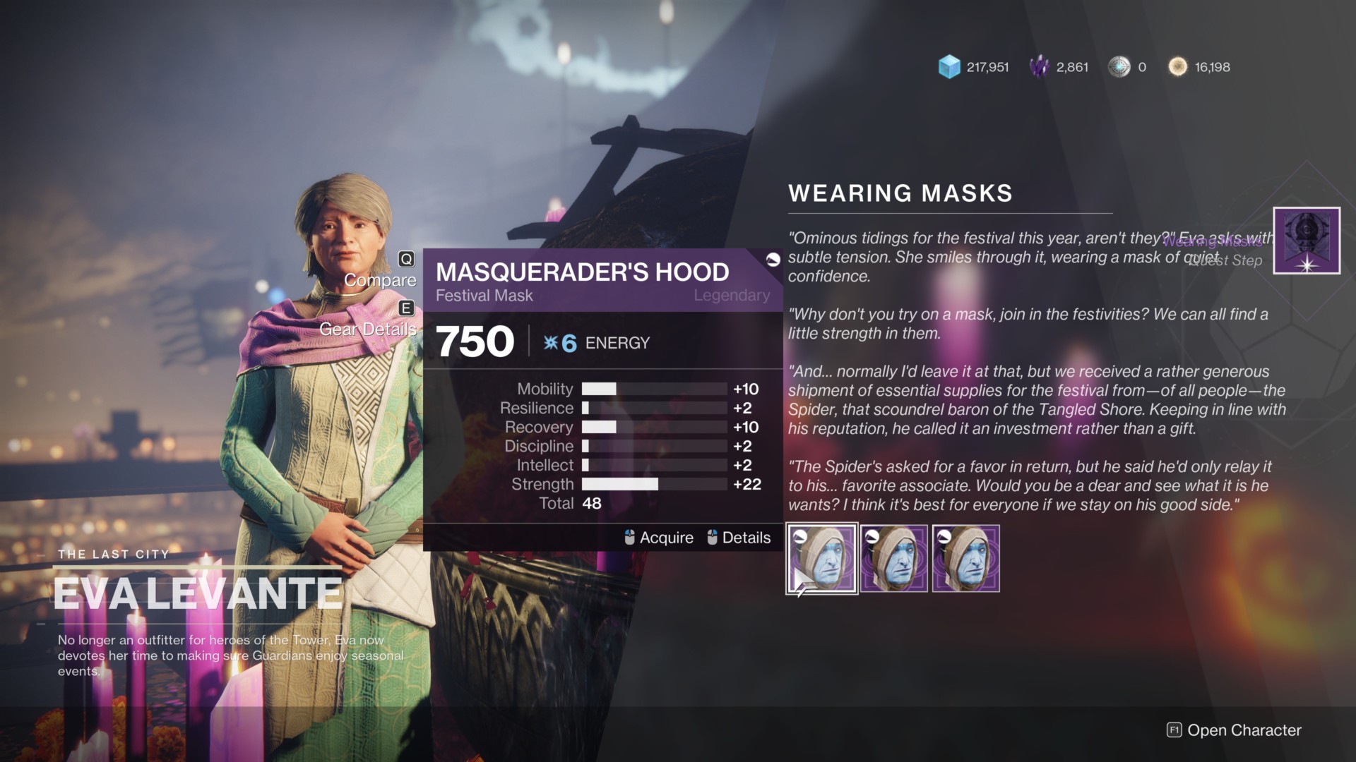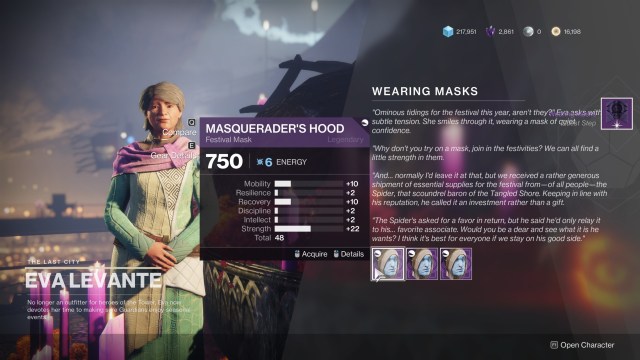 After loading in, make your way to the Tower. Take in the sights and marvel at the redecoration that occurred. Looks like everyone’s keen on feeling the festive spirit (pun intended). Anyway, go ahead and speak with Eva Levante to turn in the quest. You’ll then be able to choose from three Traveler masks (one for each element). You can still pick a different one later on by purchasing it with glimmer.