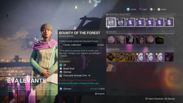 After this, take a look at all the possible bounties and rewards from Eva. These are only active during the Festival of the Lost event.