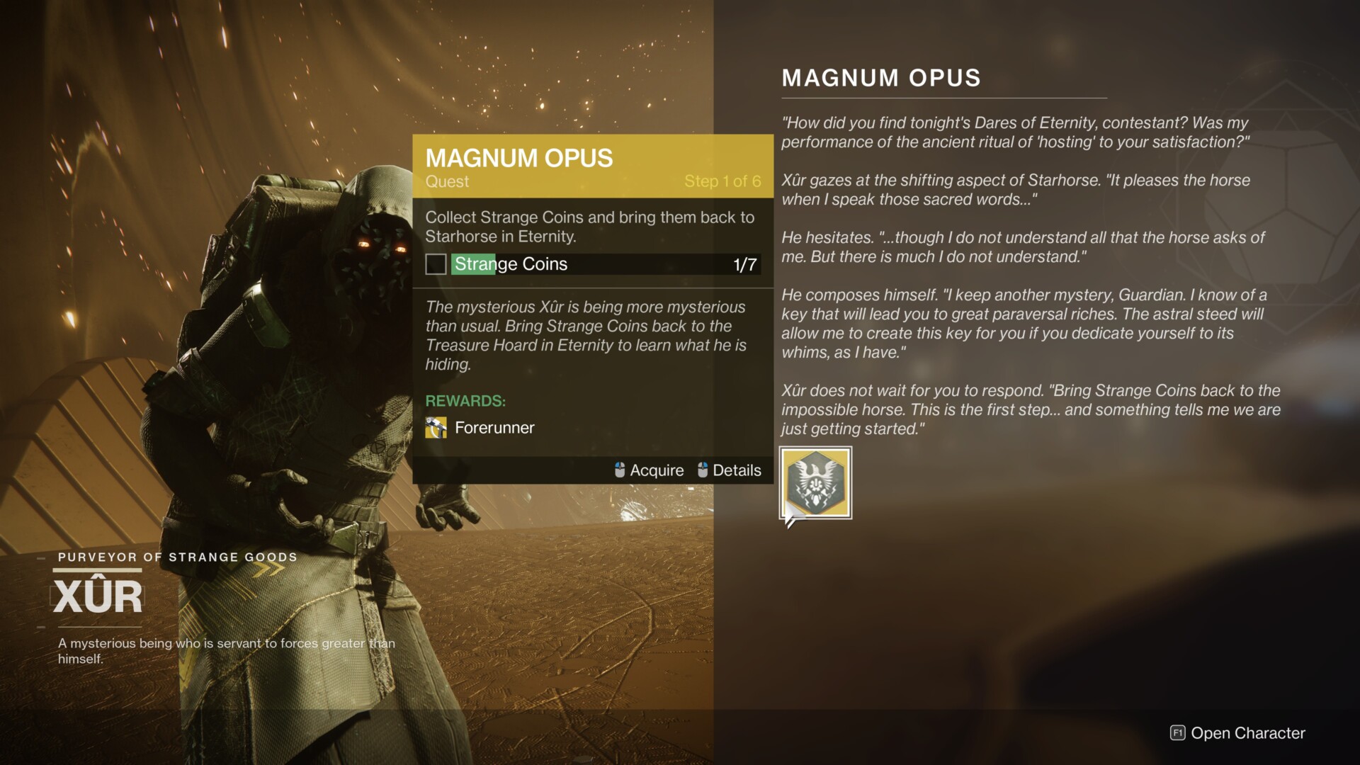The quest to obtain the Forerunner in Destiny 2 is called Magnum Opus. After clearing your first Dares of Eternity run, go ahead and visit Xur’s Treasure Hoard. Talk to Xur and check the second tab of his wares to see the quests. Magnum Opus is still greyed out, but all you need to do is use the Treasure Key from the Dares of Eternity run to open the chest next to him.