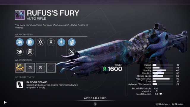 Rufus’s Fury is a bit awkward to get for yourself. But it’s definitely one of the better Auto Rifles in Destiny 2 at the moment, especially for players that like guns with large ammo counts.
