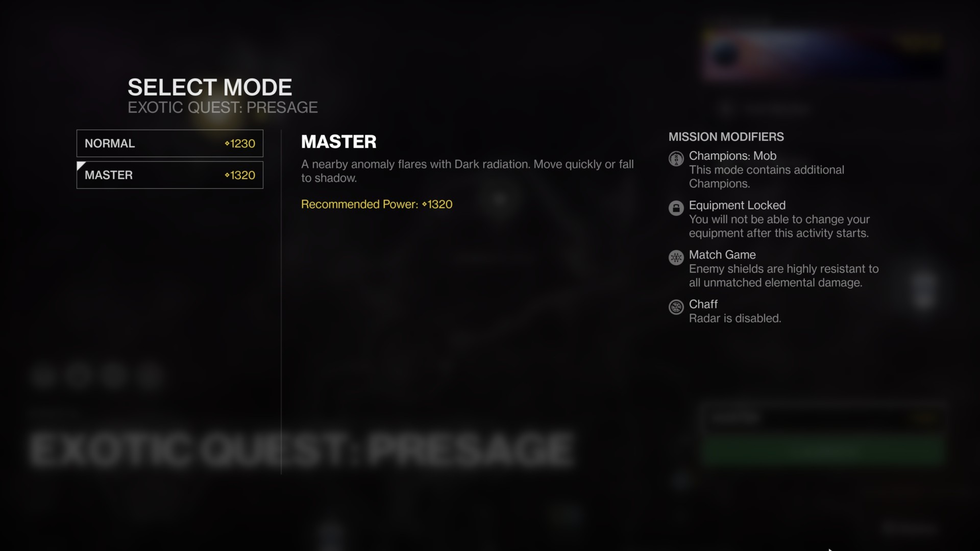 Anyway, check your director and open the Tangled Shore. You’ll notice that The Presage awards pinnacle gear upon completion. Likewise, if you click on it, the master difficulty mode should appear.