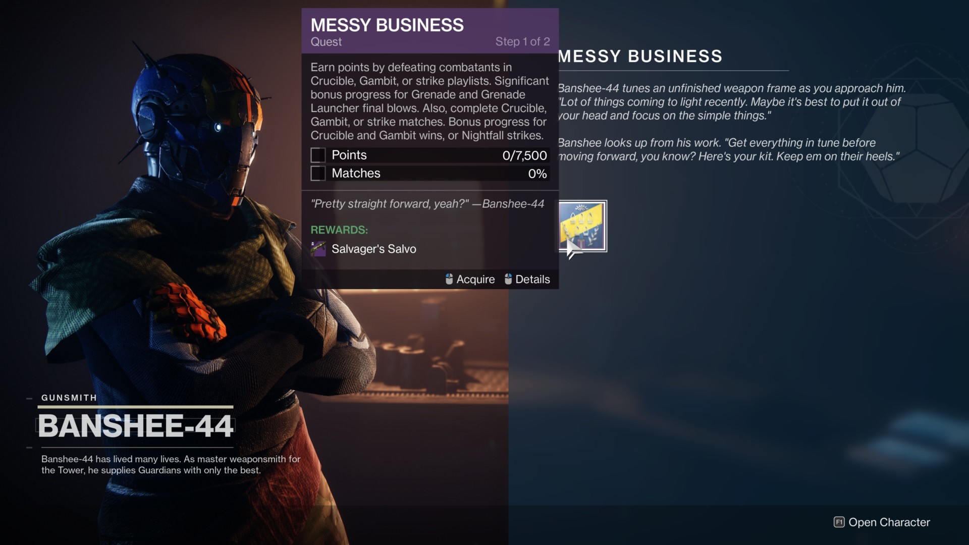 Visit Banshee-44 at the Tower to pick up the “Messy Business” quest. It has the following requirements: