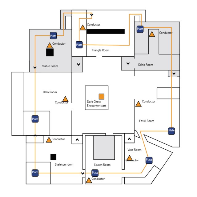 Your group will be split up into a team of three that stays in the main room and three solo players that are teleported into their own rooms. The players in the solo rooms will see three statues, one for each of the solo players. One of the solo players should call out the order of the shapes held by the statues from left to right (e.g. circle, square, triangle) because the trio in the main room will need that information.