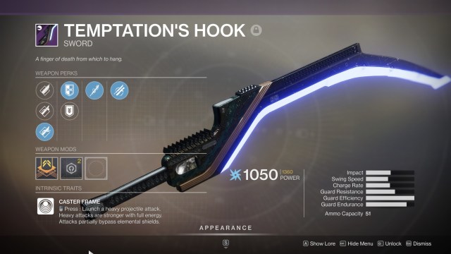 Again, this only works for armors. Now, if you do need a weapon, you could pick the Pyramid-focused Umbral Engram. It won’t give you +4 drops, but it does provide weapons when decrypted. An example would be the Temptation’s Hook sword (which is invaluable if you need a better heavy weapon).