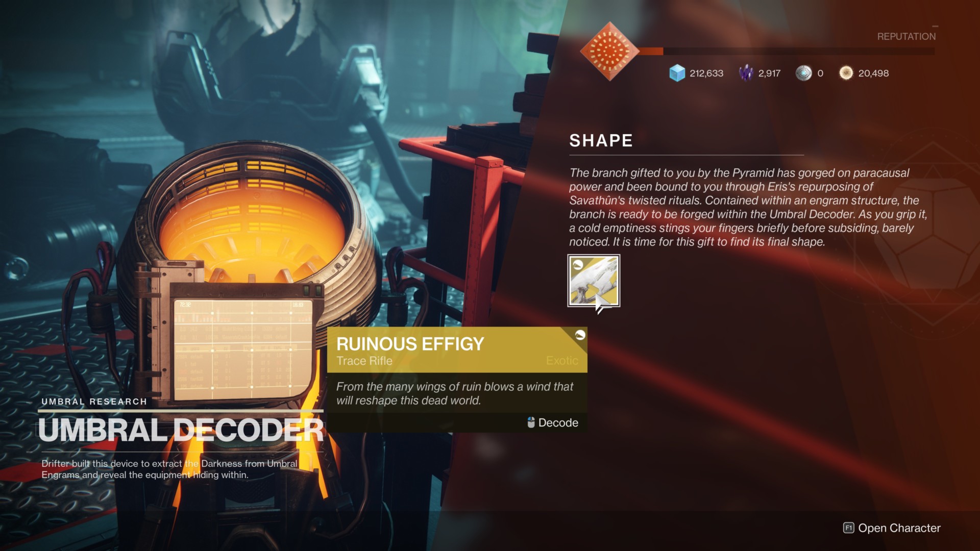 5. Shape – You’ll get an exotic engram once you’re done with the “Feed” step. Head to the Umbral Decoder in the Tower and you’ll get the Ruinous Effigy.