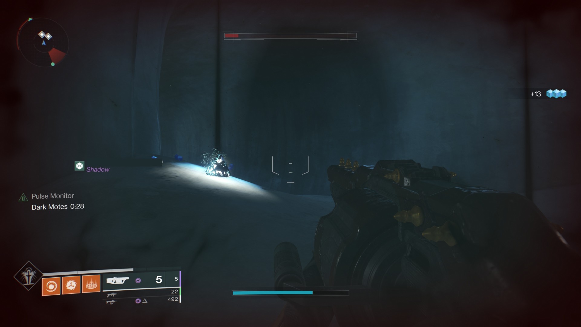 Next, here’s what a well-lit area looks like. Notice the glowing tendrils on your HUD? Standing here when you kill a Knight will drop light motes: