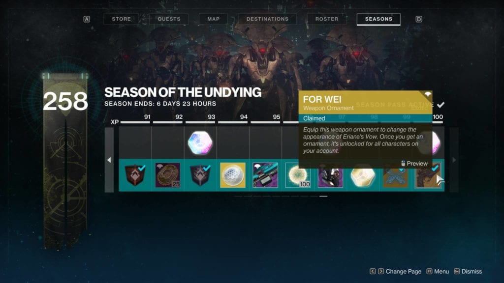 There are loads of rewards that I could still claim from ornaments, weapons, armor pieces, bright dust, upgrade modules, and the like. The gear pieces are also obtainable at your current base power level. So, if you already have a character at 960, pick up those Temporal Clauses, Eriana’s Vows, and Pluperfects to get maxed out weapons.