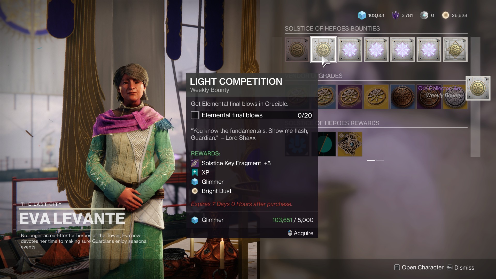 Eva also has several bounties. The weekly bounties provide Solstice Key Fragments, XP, Bright Dust, and Glimmer. Meanwhile, the daily and additional bounties give you Solstice Key Fragments and XP only.