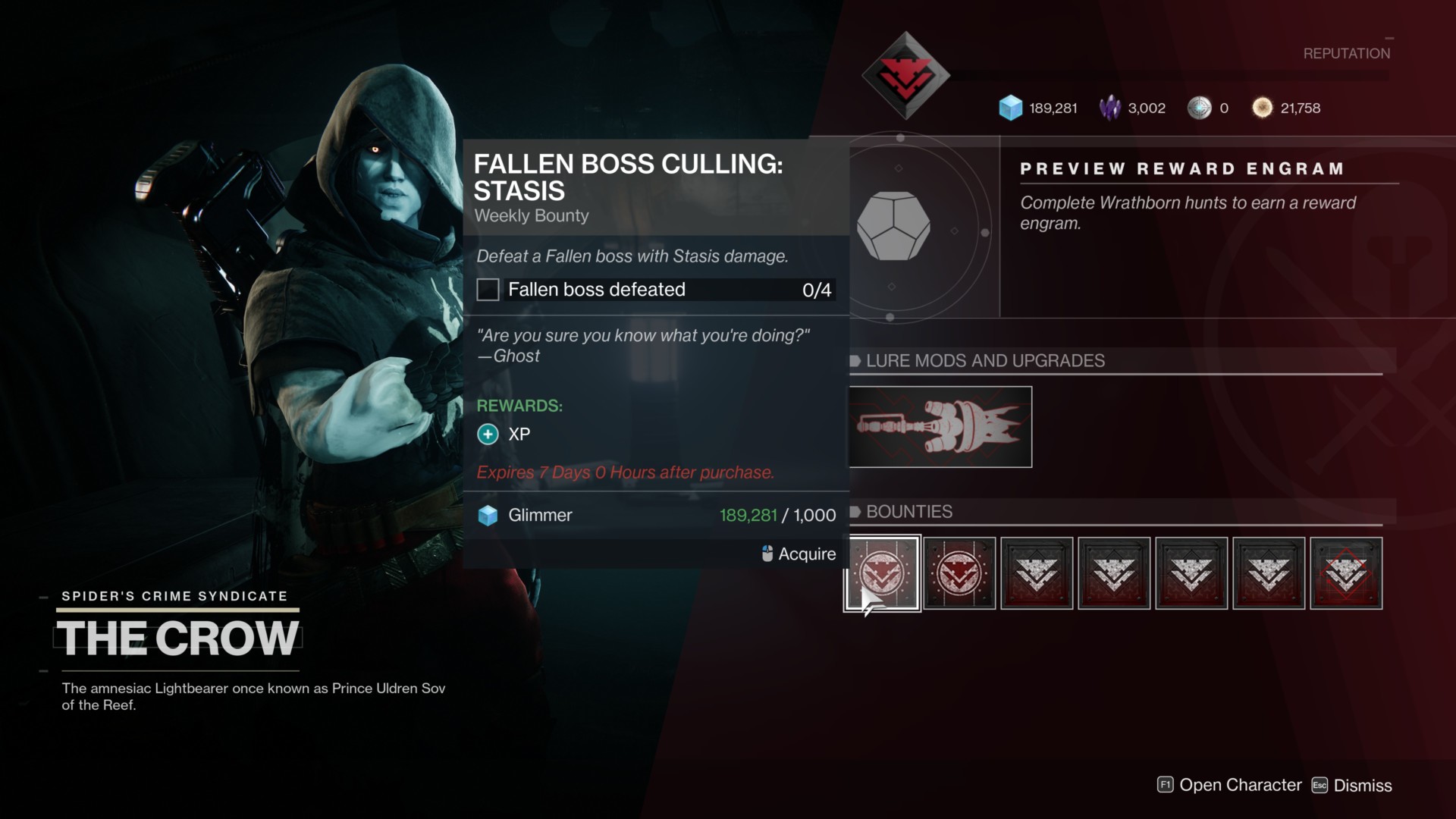 Anyway, since you haven’t gained any reputation with the Crow yet, you can only do Fallen Wrathborn Hunts for now. Upon reaching reputation rank 2, however, you should be able to obtain the Improved Seeker I upgrade that lets you battle the Hive Wrathborn Hunt targets. Just remember that for each Wrathborn Hunt that you plan on doing, you’ll need to have a stored Cryptolith Lure charge from playlist activities.