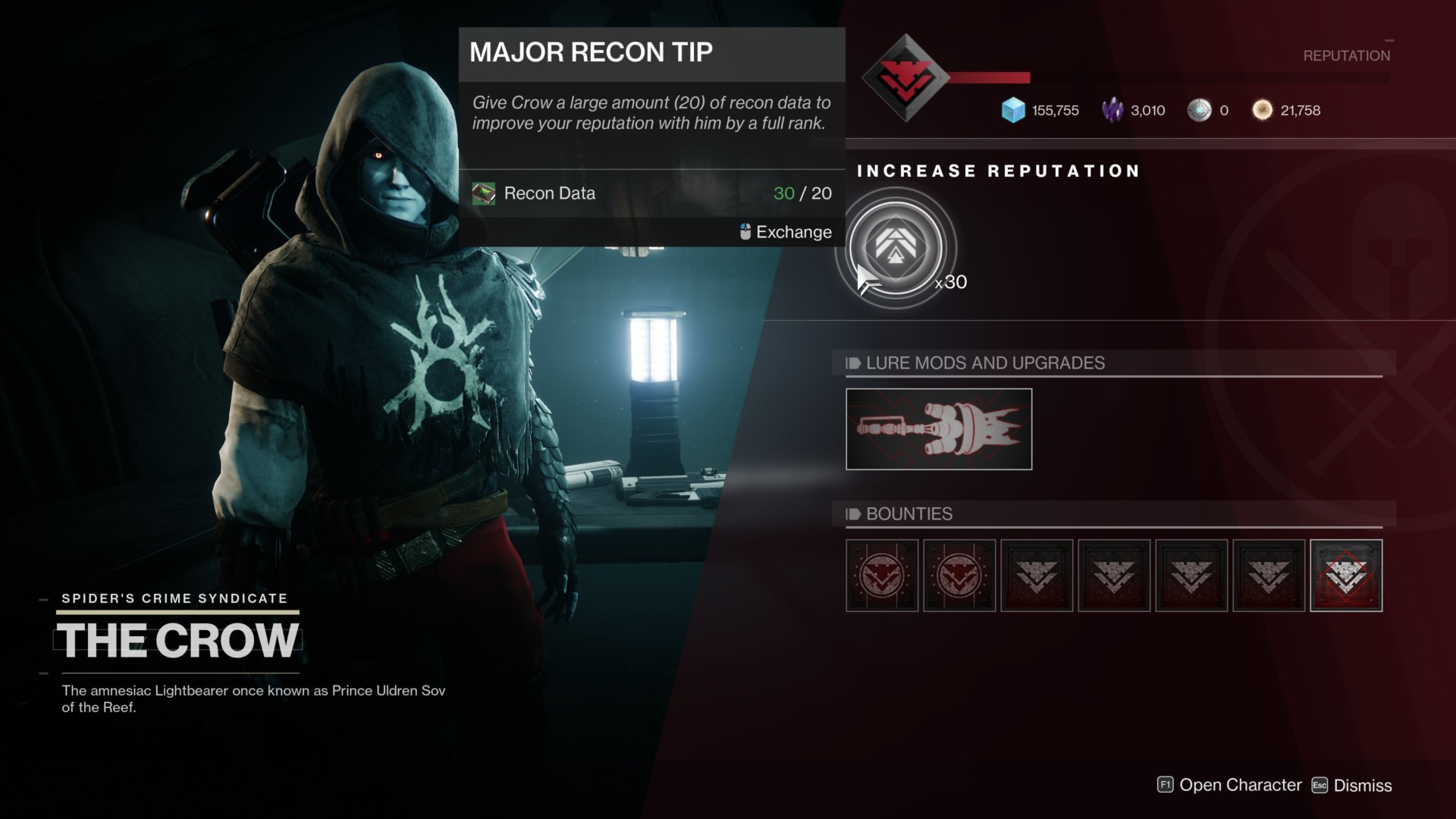 Return to the Crow for additional instructions. Also, go ahead and check your season pass. You should be able to grab some Recon Data from some of the ranks. Remember that you’ll need 20 Recon Data to increase your reputation by one level. This means completing more Wrathborn Hunts (and the associated “charging” mechanic via playlist activities). The boss kills at the end will net you more Recon Data for your rep boosts and, subsequently, more Cryptolith Lure upgrades.