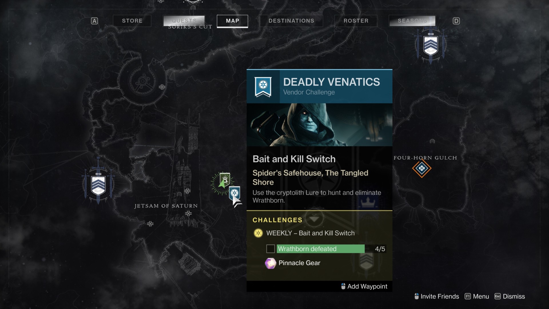Furthermore, don’t forget to open the map. You’ll notice that the Crow now has a weekly challenge. After you finish five Wrathborn Hunts, you’ll get a tier 3 powerful drop.