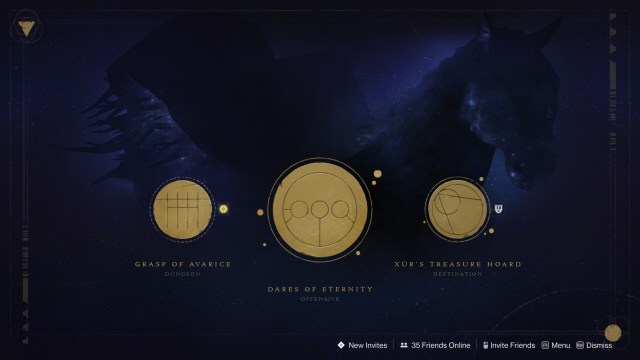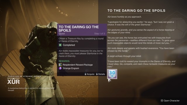 You’ll begin your first Dares of Eternity run after launching Destiny 2 (as long as you’ve updated the game). Once that’s cleared, a new location called Eternity will appear in the Director. One of the selections takes you to Xur’s Treasure Hoard. Here’s our Destiny 2 guide to help you with the Starhorse bounties, the rewards from Xur, the acquisition of Strange Coins, and the gargantuan treasure chests.