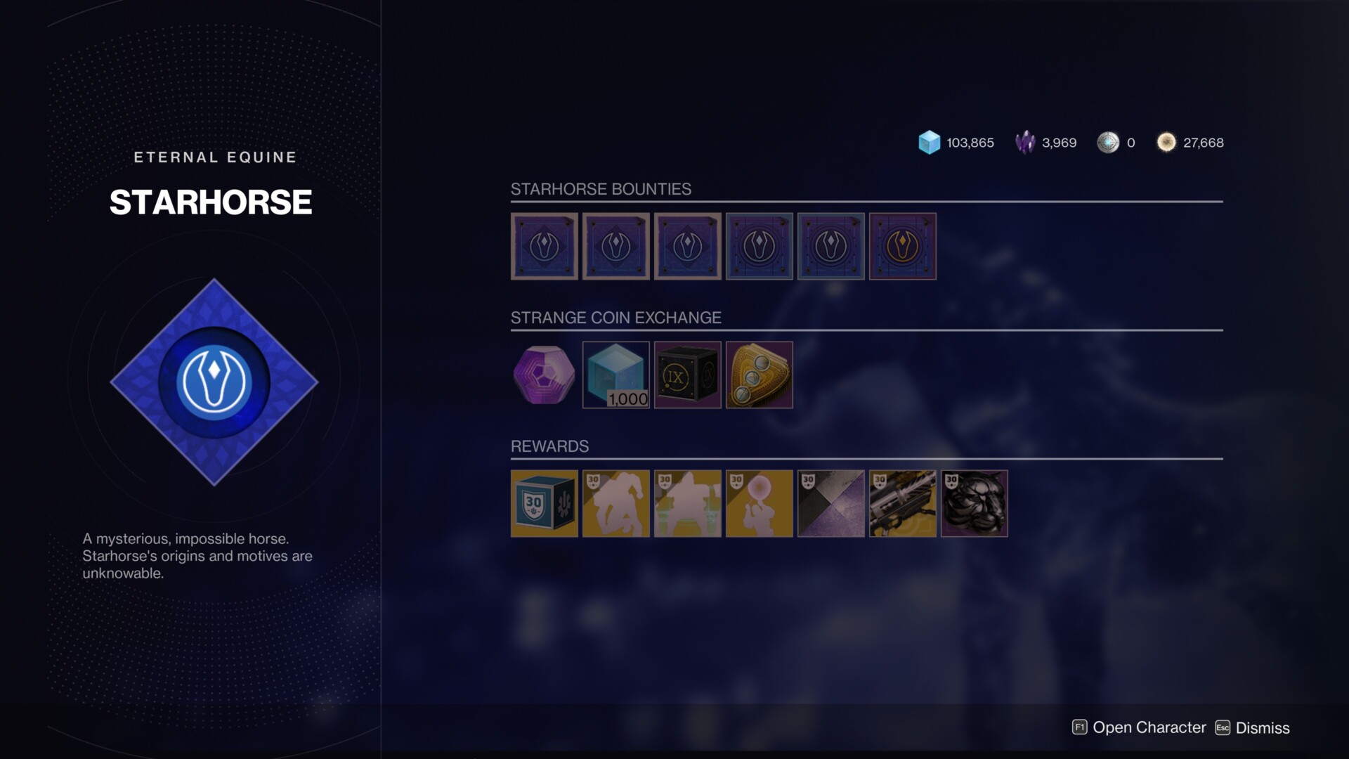 Xur’s cosmic pal, Starhorse, also serves as a vendor of sorts. The celestial creature has the same Triumph Rewards, but there’s additional stuff that you can obtain if you exchange Strange Coins.