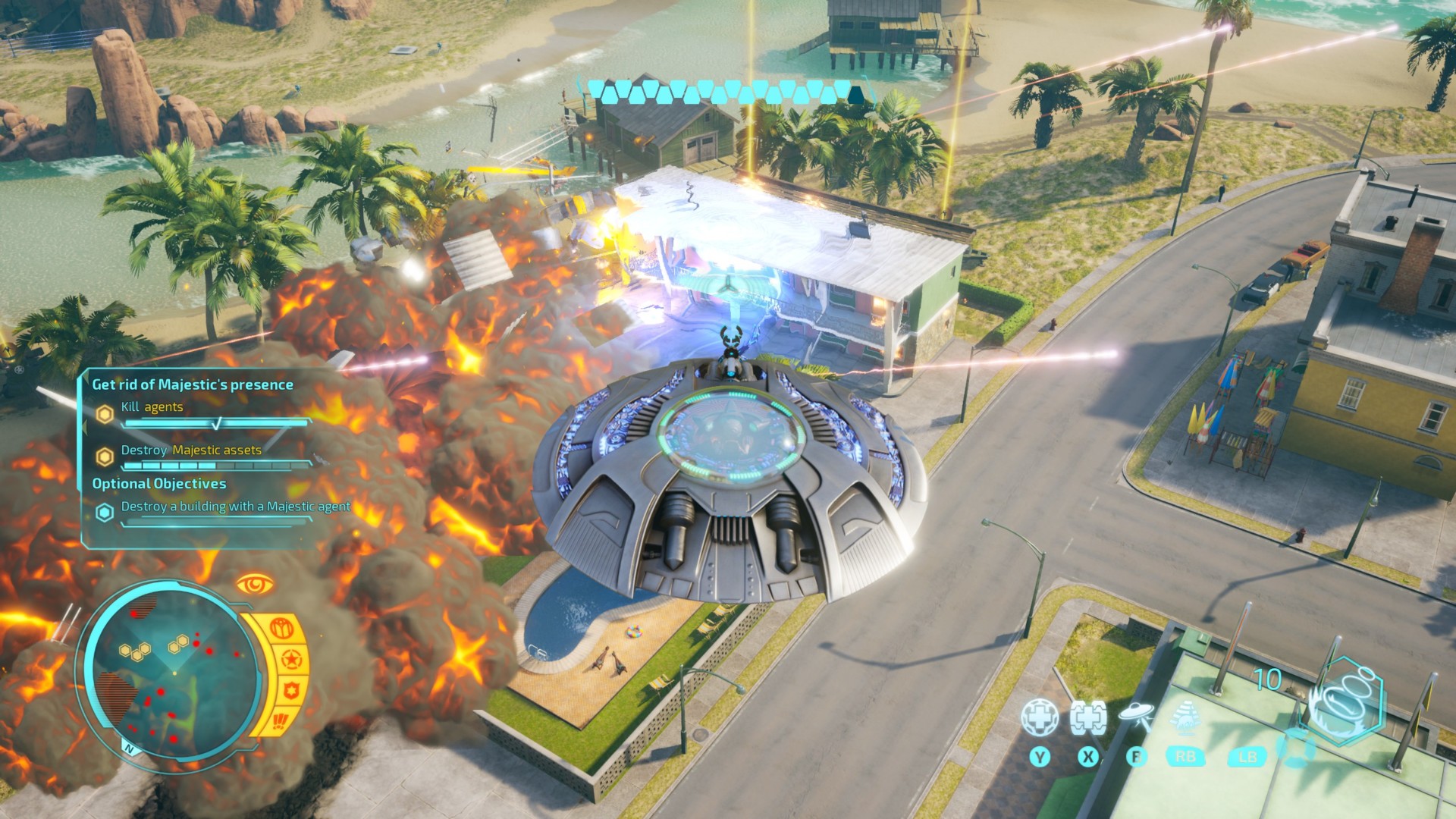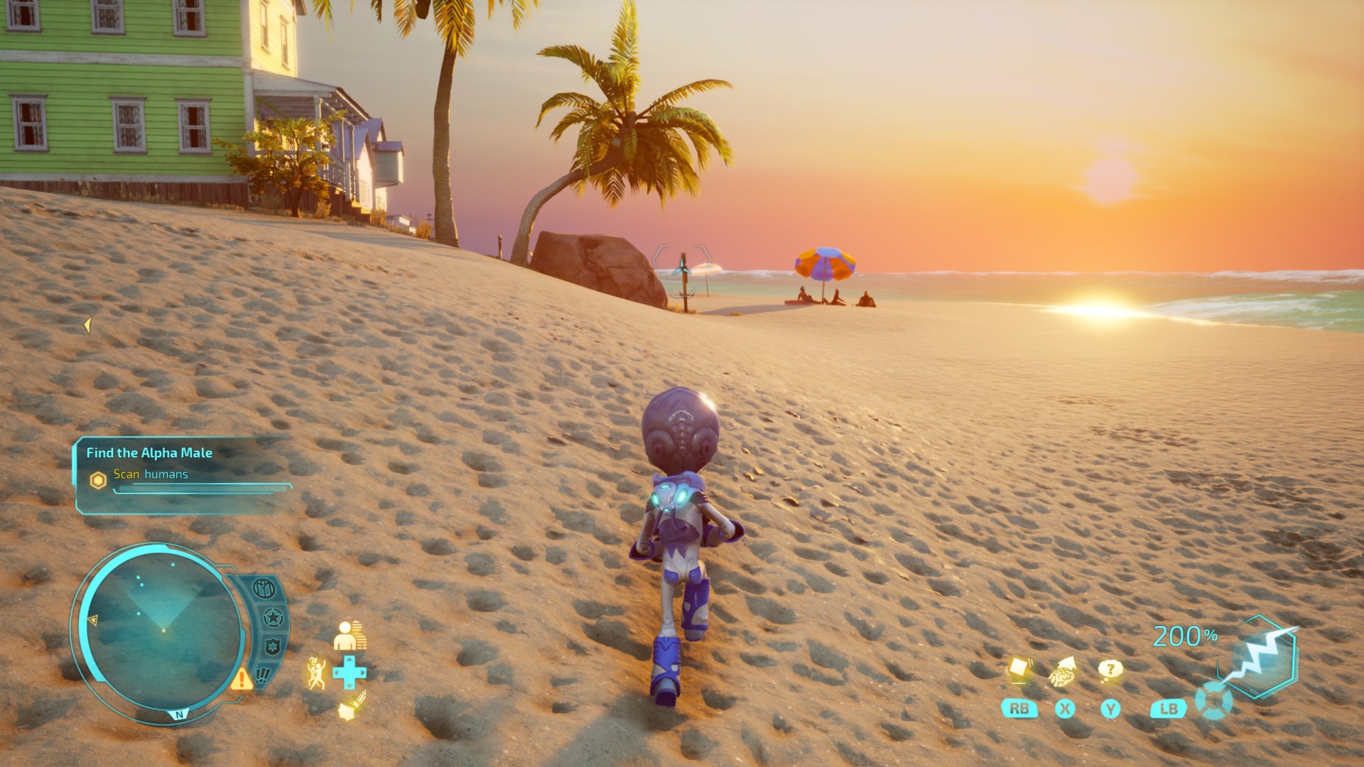 But sometimes you can’t really get into these zones while disguised, as Crypto can’t jump high enough in human form. So you’ll have to awkwardly jetpack onto a building without being seen and then hope you can disguise yourself from the roof. And even though the game is quick to stress that you need to remain undetected, these sections often end with mandatory combat encounters where you get discovered anyway. It all feels haphazard. It’s like the missions are just the sandboxes with generic markers strewn about. You can also explore the maps outside of missions and take on four repeated challenges — races, rampages, abductions, and Armageddon. But these are just as repetitive and tedious as the mission objectives.