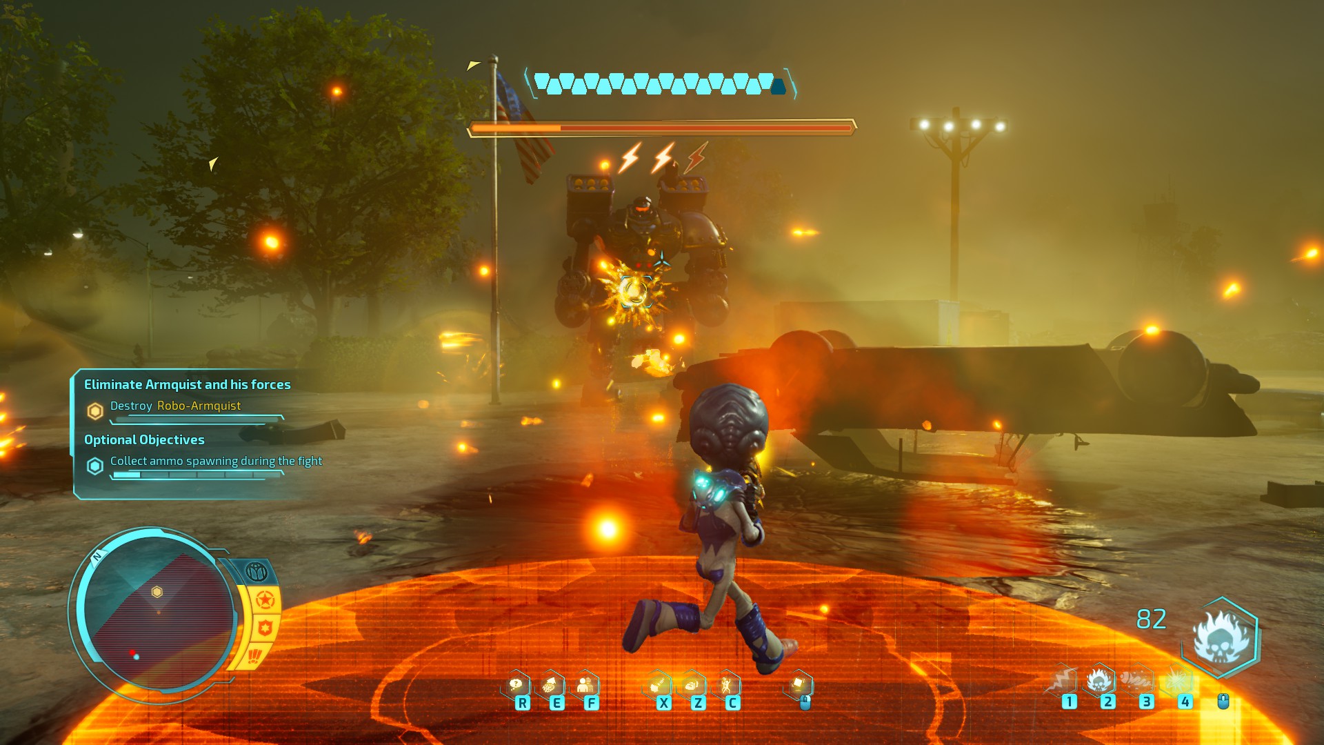 The forced sections where you’re meant to walk around while disguised, in particular, wear out their welcome very quickly. It doesn’t help that many of these are poorly designed. Destroy All Humans! uses the same restricted area logic as old Assassin’s Creed games. These areas are gated off by distinct red zones on your minimap. If you’re seen without the proper disguise while in one of these zones, the game will force you to restart from a checkpoint.