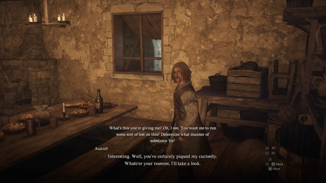 And once you’re there, go and find Radcliff who should be marked on your map thanks to the quest’s waypoint. Give him the Unlabeled Medicine and after a while, he’ll have analyzed it for you and discovered how dangerous it is.