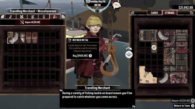 It’s easy to overlook the fact that the Merchant sells Refined Metal since it’s found in the far-right tab on the Shipyard screen there, something that doesn’t exist for the Shipwright on Greater Marrow. Once you figure it out though you’ll have access to a steady supply of Refined Metal for $500 a piece, less if you have discounts from certain Books. You can only buy one piece at a time, but the Merchant will restock with another after an in-game day passes, so you can just rest repeatedly to grab as many as you need.