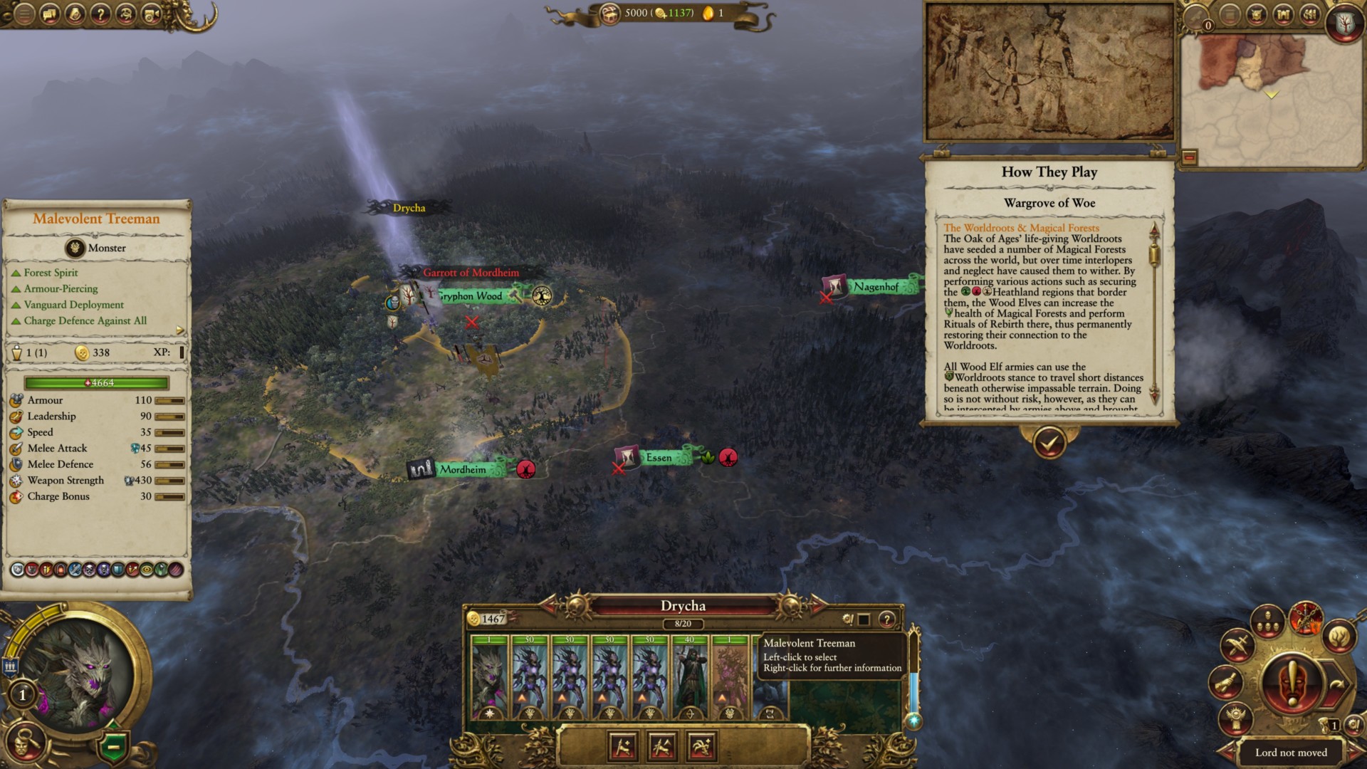 Note 1: As mentioned in our Wood Elves rework guide, the Mortal Empires campaign has eight magical forests and Athel Loren/the Oak of Ages is the “main” forest in the campaign. The other forests, as you heal them up, will also restore Athel Loren’s forest health over time.