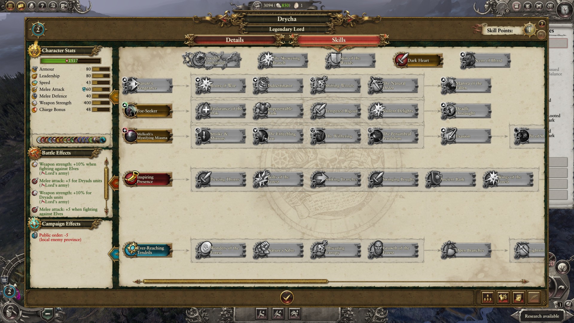 Likewise, Drycha has a Wood Elf Waystalker hero, so you probably want some perks that help with training your units and wounding/assassinating foes. You could also grab “Arrow of Kurnous” and “Prey of Anath Raema” to pin down and snipe lords and heroes. Lastly, don’t forget to recruit a Branchwraith (Lore of Life) later in your Total War: Warhammer II campaign. You’ll be focusing on a lot of tree units, which means “Earth Blood” and “Regrowth” are necessary spells (plus “The Dwellers Below” adds some AoE damage).