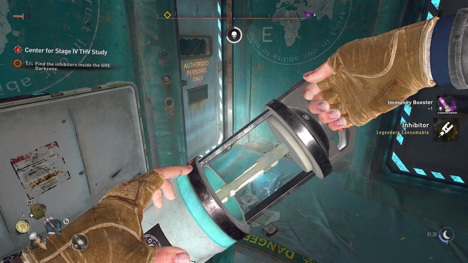 Speaking of your immunity timer, it’s nighttime and you’re exploring an interior, so make sure you bring Immunity Boosters. Also, it’s possible to go back to the room near the entrance, which has a UV lamp (there are other sections with UV lamps as well).