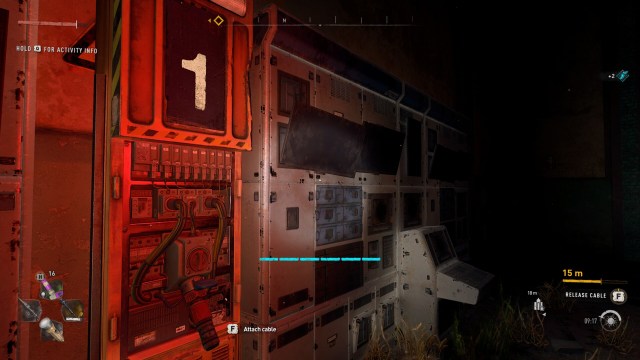 Next, we’re going back to the main cable — 1/A/B — to disconnect that. Grab the cable again and bring it to Terminal A in the upper area. Go ahead and open the gates marked with A (including the one that’s submerged).