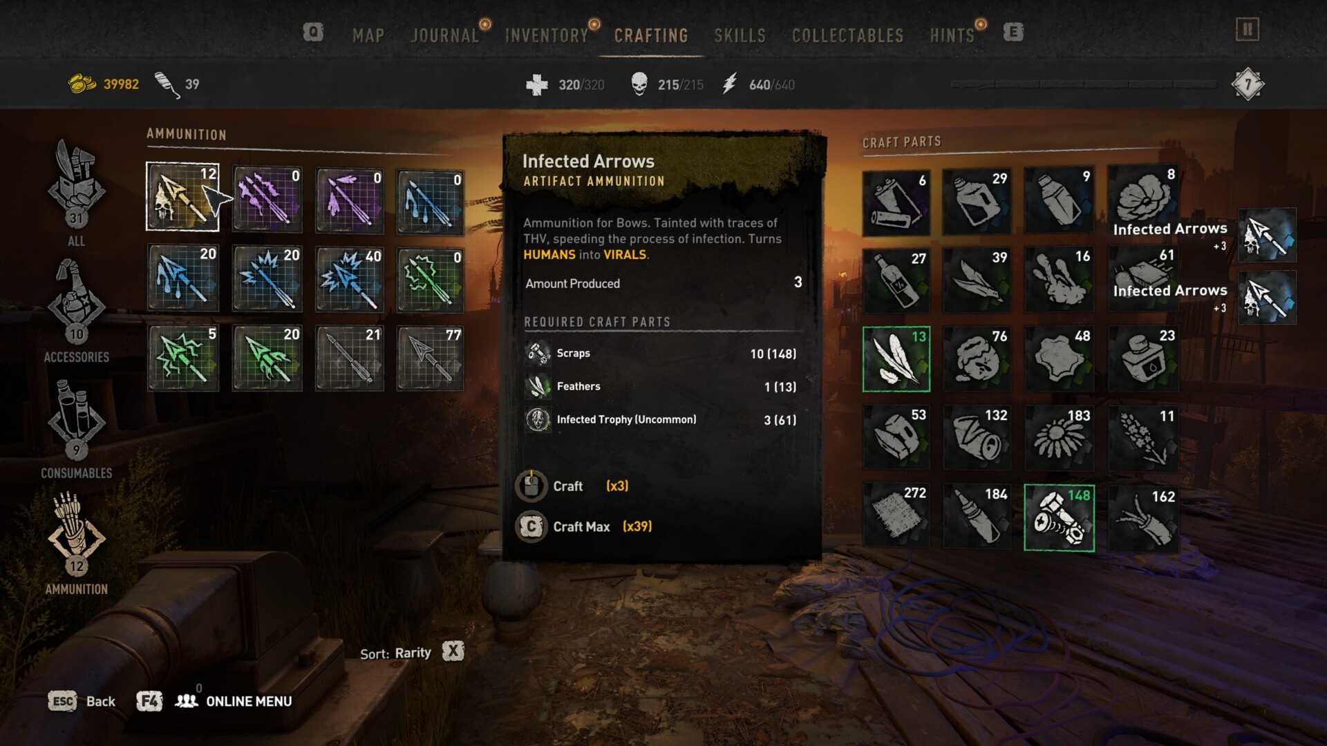 - 3x Infected Arrows – 10x scraps, 1x feathers, and 3x infected trophy (uncommon). Make sure you find a bow so you can swap to and use this ammo type.