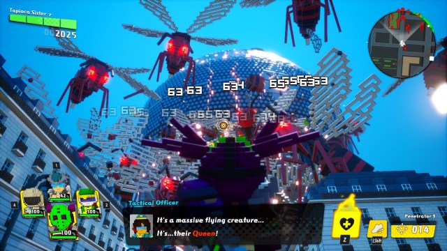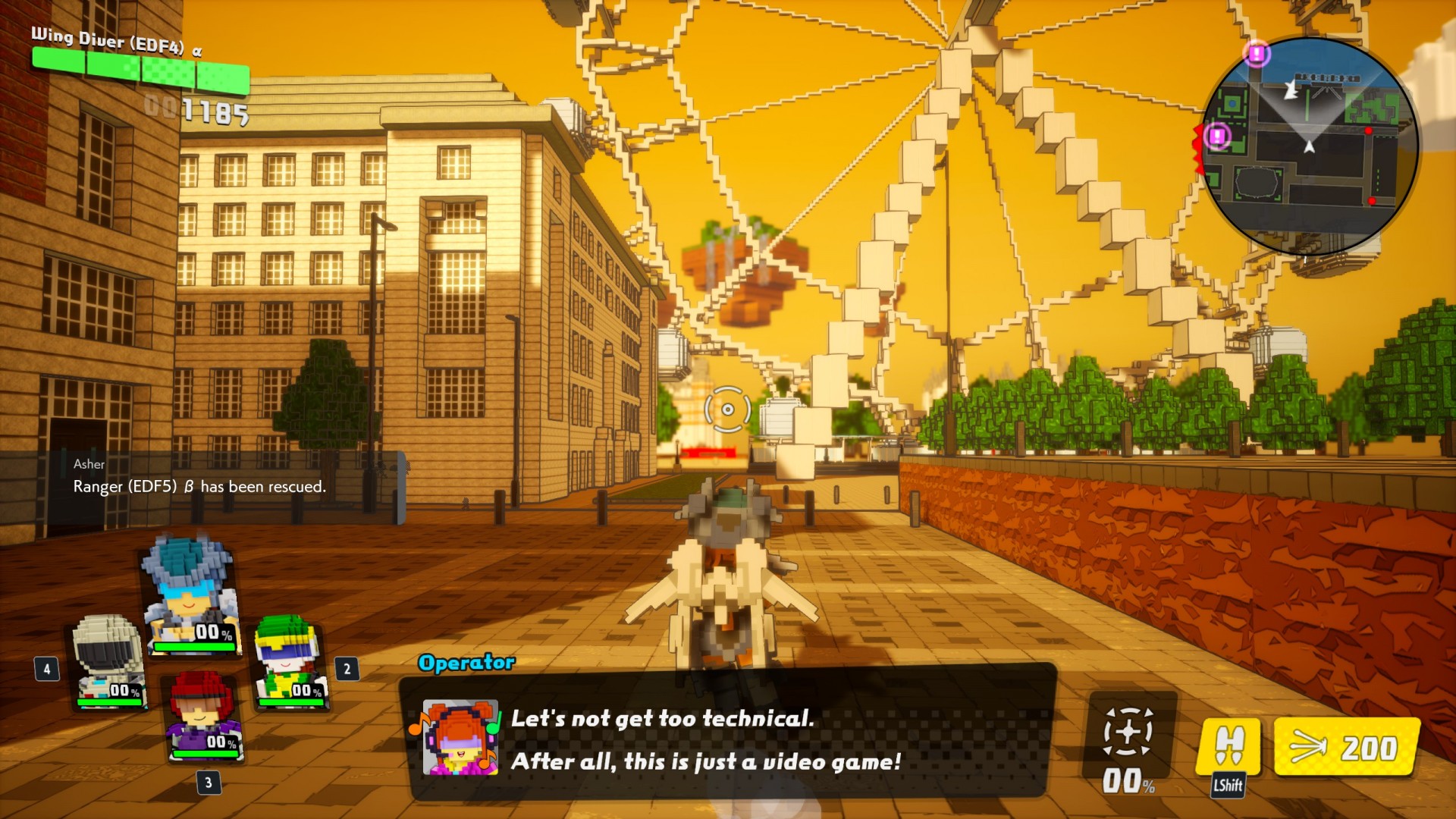 All the dialogue is fully voice-acted and often quite funny. One character routinely breaks the fourth wall, frequently to talk about the EDF series itself. She points out that an enemy is from one game or another, mentions the numeric entries, and the others have no clue what she’s talking about. The plot of Earth Defense Force: World Brothers concerns an alien invasion, of course. Only, because the game is voxel-based, the Earth is a cube instead of a sphere. And that cube has been blown into pieces, yet it’s still intact. You need to scare away motherships that create dark mist to somehow put the Earth back together. Yes, it’s stupid. It’s meant to be.