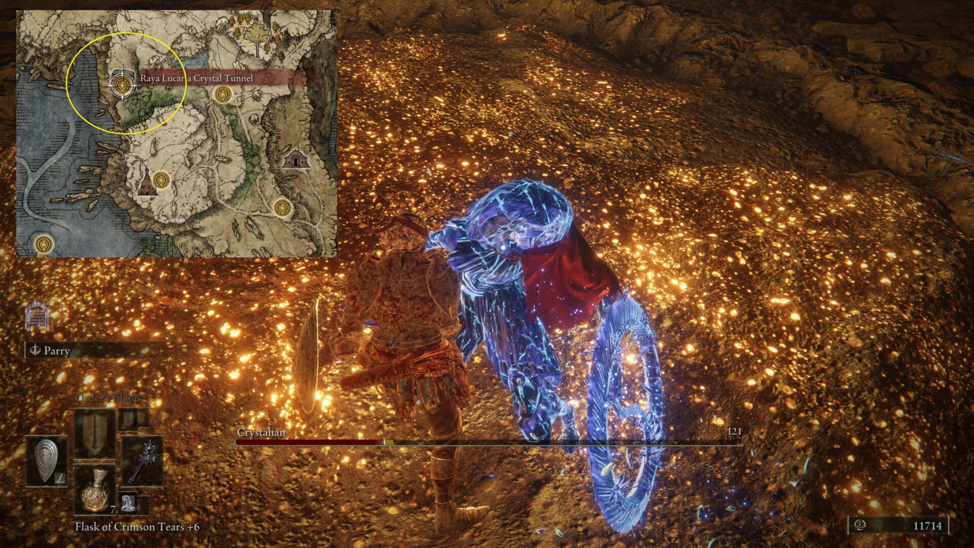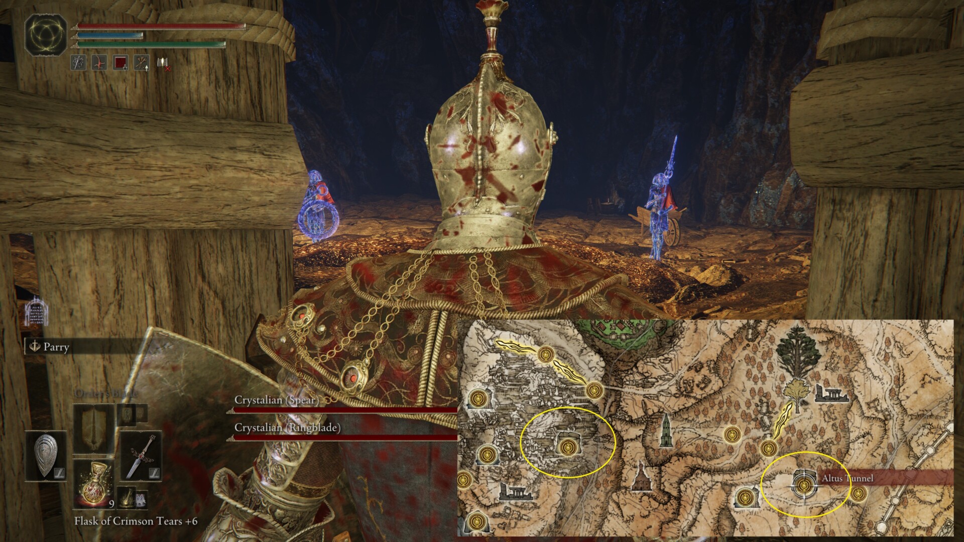 Altus Tunnel is south of the Minor Erdtree in the region. You’ll find two Crystalians here. The ringblade user is the same as the one you fought in Raya Lucaria Crystal Tunnel. However, the spear lady will annoyingly poke you without end. If you have a blunt weapon that you can swing in a wide arc, you can hit and break the guard of both if they’re close to each other.