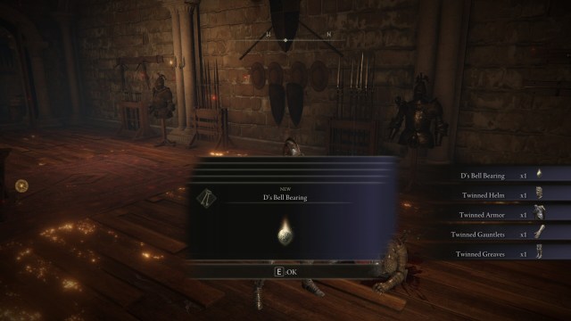 After defeating the Fire Giant boss, you can approach the Forge of the Giants (i.e., huge cauldron). This is one of the game’s “soft” points of no return. A character will offer to sacrifice themselves to become kindling, burning the Erdtree as well. When you return to Roundtable Hold, it’s in ruins, with several NPCs that are missing. If you go past the hallway where the blacksmith is, you’ll see a room with D’s corpse. You can pick up his full armor set and Bell Bearing in Elden Ring.