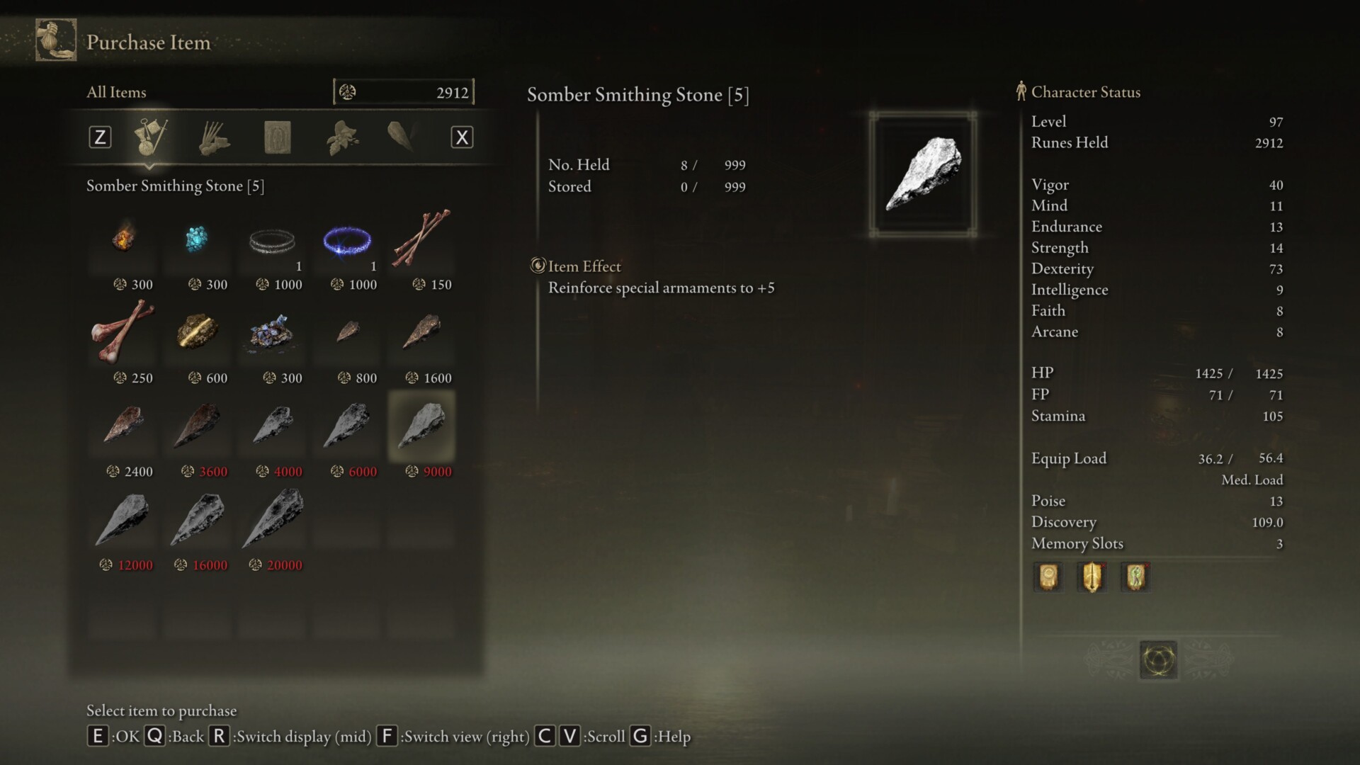 Later, though, you’ll get to acquire Bell Bearings in Elden Ring, key items that will add to the vendor’s wares. These include bones and crystals for crafting. Even better, some types will allow you to buy Smithing Stones and Somber Smithing Stones, with absolutely no limit save for the cash you have on you. As such, this is a great way to upgrade your weapons.