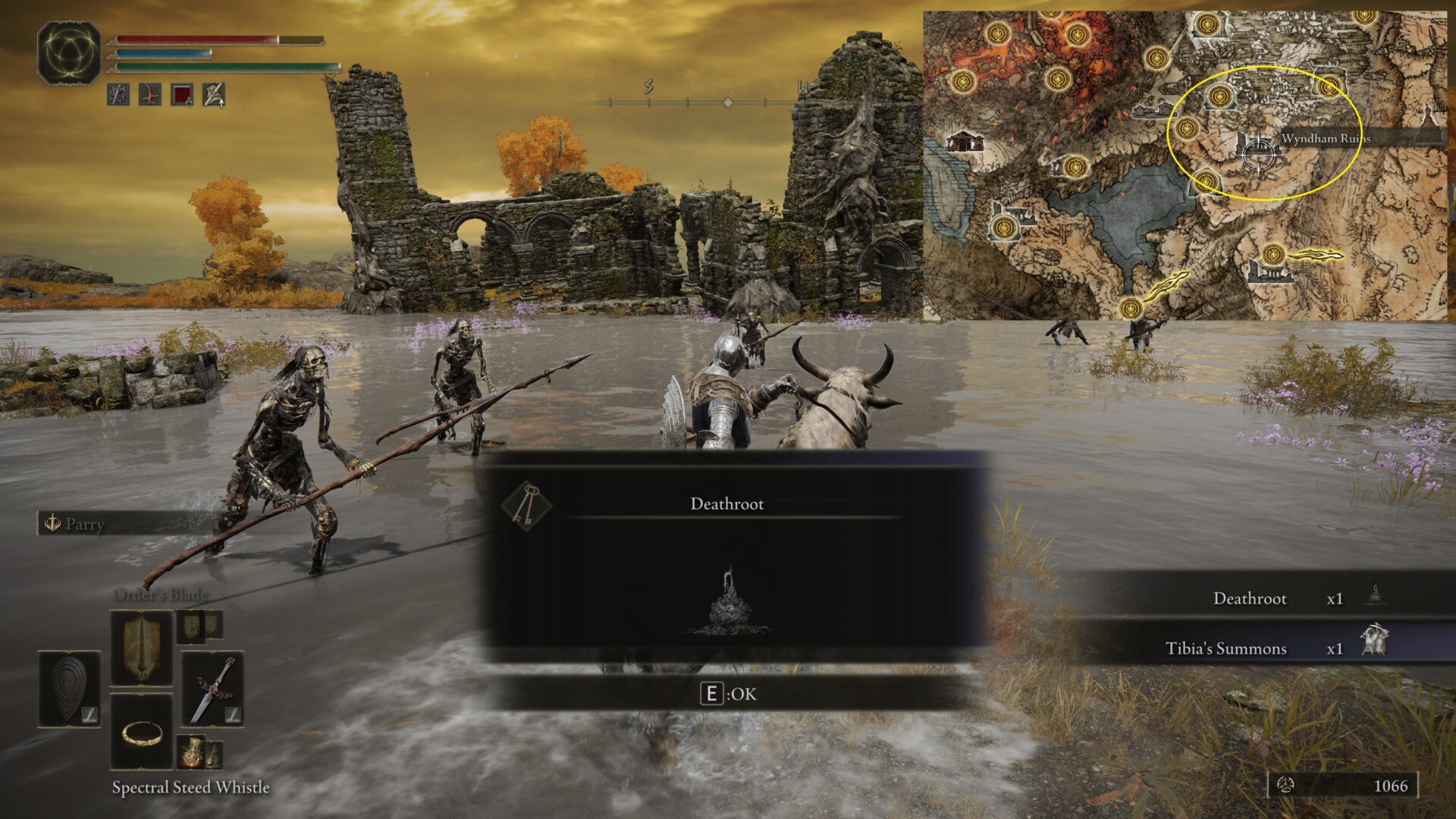 - Tibia Mariner – The Tibia Mariner in Summonwater Village (Limgrave) and Wyndham Ruins (Altus Plateau) both drop Deathroots.