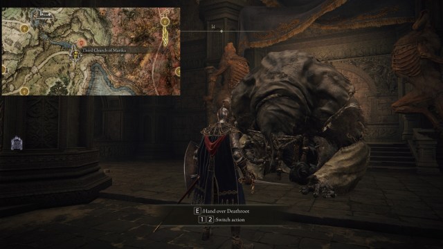 Now, let’s say that you’ve been following our Limgrave dungeons and secrets guide. Then, it’s possible that you’ve picked up a Deathroot key item from the boss in Deathtouched Catacombs. You can bring this (or any other Deathroot you’ve acquired) to D. He’ll then offer to introduce you to his pal, Gurranq, the Beast Clergyman of Caelid.
