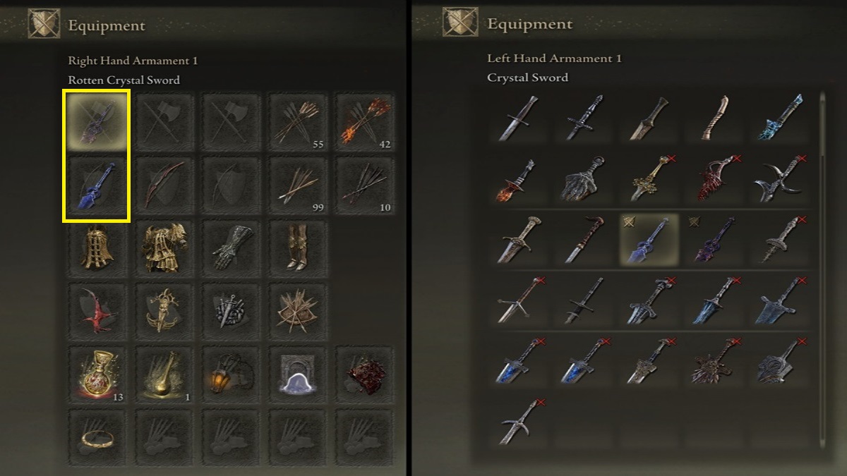 Both dual-wielding and power stance in Elden Ring work much in the same way in that you’ll need a weapon equipped in both hands. Simply open your inventory and make sure that you have your armaments in the first and second rows (i.e., right hand/mainhand and left hand/off-hand respectively).