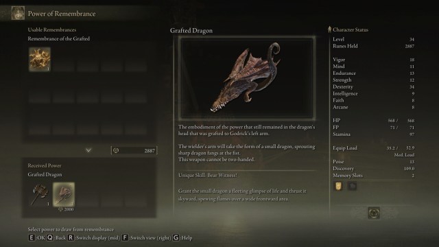 Lastly, don’t forget to return to the Roundtable if you haven’t done so. Finger Reader Enia (the prophet in the Two Fingers chamber) lets you exchange the other key item that Godrick dropped. You can select either of these two: