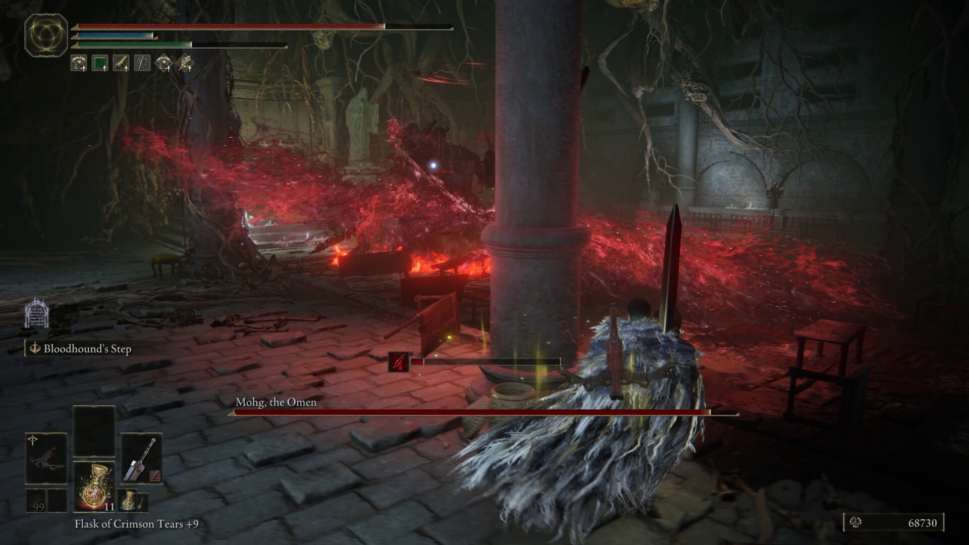 Mohg’s arena gives you a small advantage. You fight him in the Cathedral of the Forsaken, an underground church of some sort, complete with wooden pews and stone pillars. If you’re fighting him at medium range, stand near one of those pillars. You can duck behind one, and it’ll block the bleed fire. Just keep it in mind that he destroys the pillars with his melee swings. So, try and use them as much as you can until they’re gone.