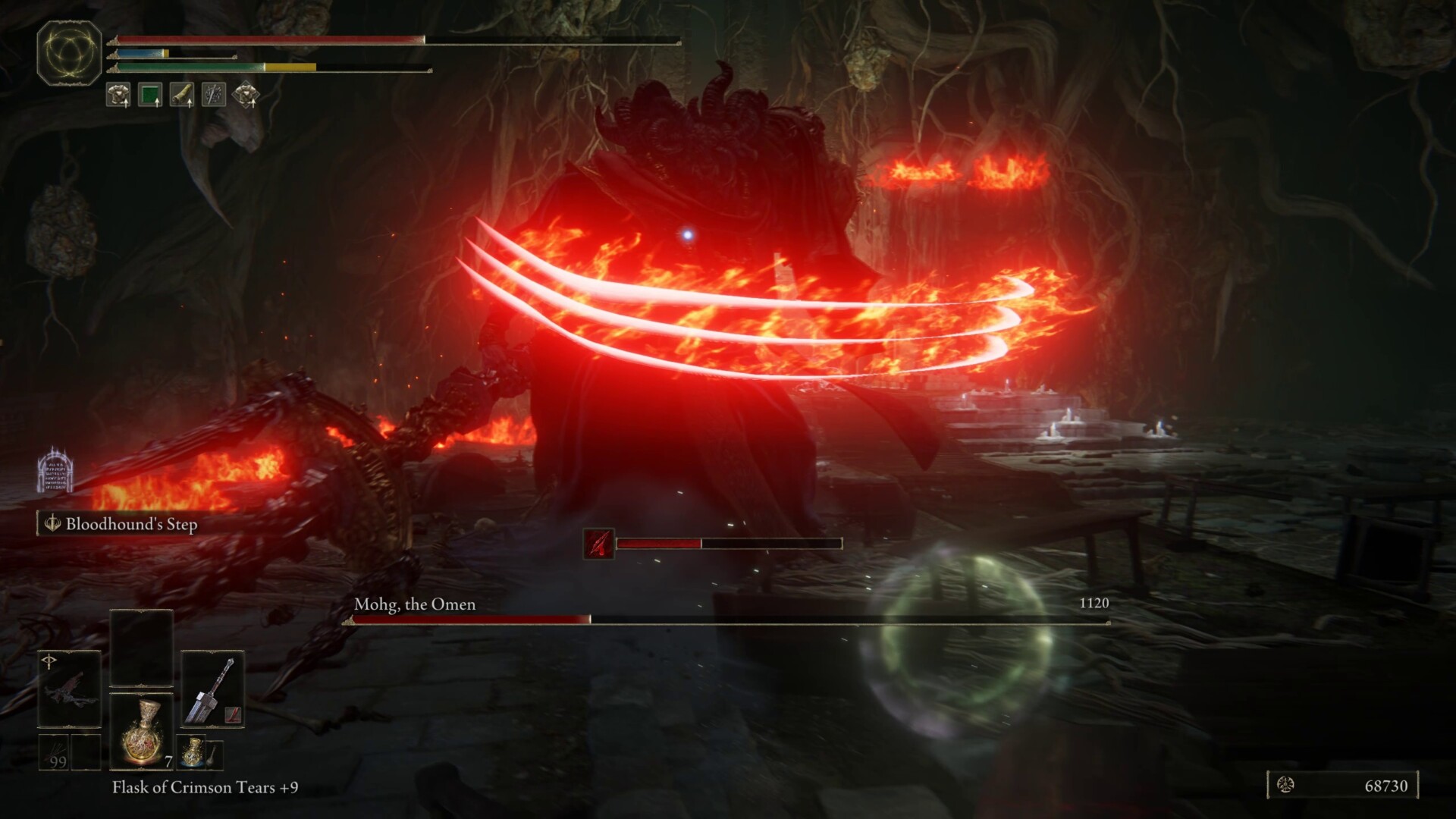 • Bleed fire – This is Mohg’s favorite move, and he’ll use it often. When you see his hand go up into a swirling, red “whirlpool,” get read for him to throw bleed fire your way. He’ll toss it in a line in front of him, or in a half-circle arc. If you’re close enough, he’ll have the whirlpool drop of shower of bleed fire (aka, Blood Rain), preventing you from going in for melee attacks from the front.