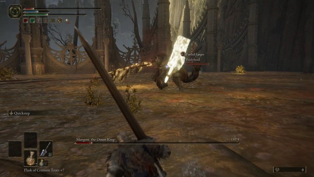 Morgott’s attacks are fairly simple to dodge up until he’s at half health. His melee swings can be dodged either forward, backward, or to the side. Once he stops attacking, get some melee or spell damage in. Morgott’s daggers can be dodged as well. Just track them with your eye and move once they get close. His spear move takes a couple seconds to charge. Again, dodge this the moment he’s close and follow up with an attack of your own.