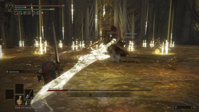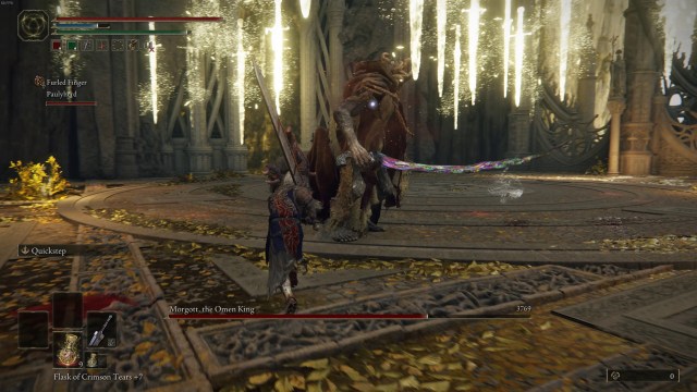 His sword rain attack is a different matter. He sets it up by conjuring a holy sword that he points to the ground. Glowing swords gather in the air and, once he thrusts the sword into the ground, they fall. Give Morgott some distance has he prepares this move. The blades keep falling, but only in patches. You can maneuver around them and continue to fight Morgott.