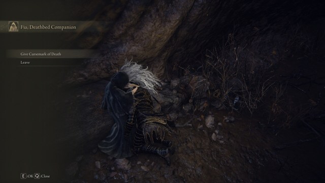 As you talk to Fia, she’ll mention a “hallowbrand” of sorts. This is when you can give her the Cursemark of Death. You’ll receive the Radiant Baldachin’s Blessing (increases poise by spending FP).