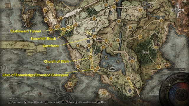 Since this is the Elden Ring Limgrave walkthrough guide, we’ll focus primarily on the objectives that you need to do to get to the next boss and progress the campaign. Still, I might talk about or link some optional stuff on the side. You may also read our dungeon and secrets guide for this region to see other points of interest. In any case, here’s the map with the landmarks that we’ll visit:
