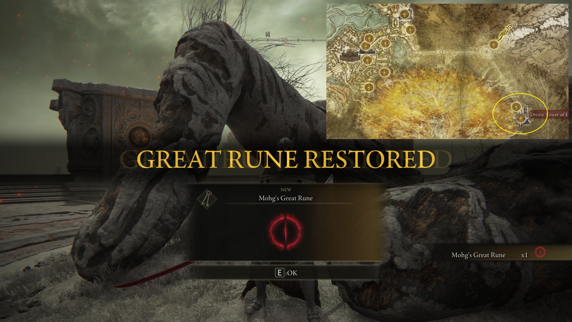 Likewise, you’ll obtain Mohg’s Great Rune. To activate it, just head to the Divine Tower of East Altus. It’s the other path from Leyndell Royal Capital Outskirts, not the one heading to the Forbidden Lands/Grand Lift of Rold. You can’t miss it since it’s also the same place where you activated Morgott’s Great Rune.