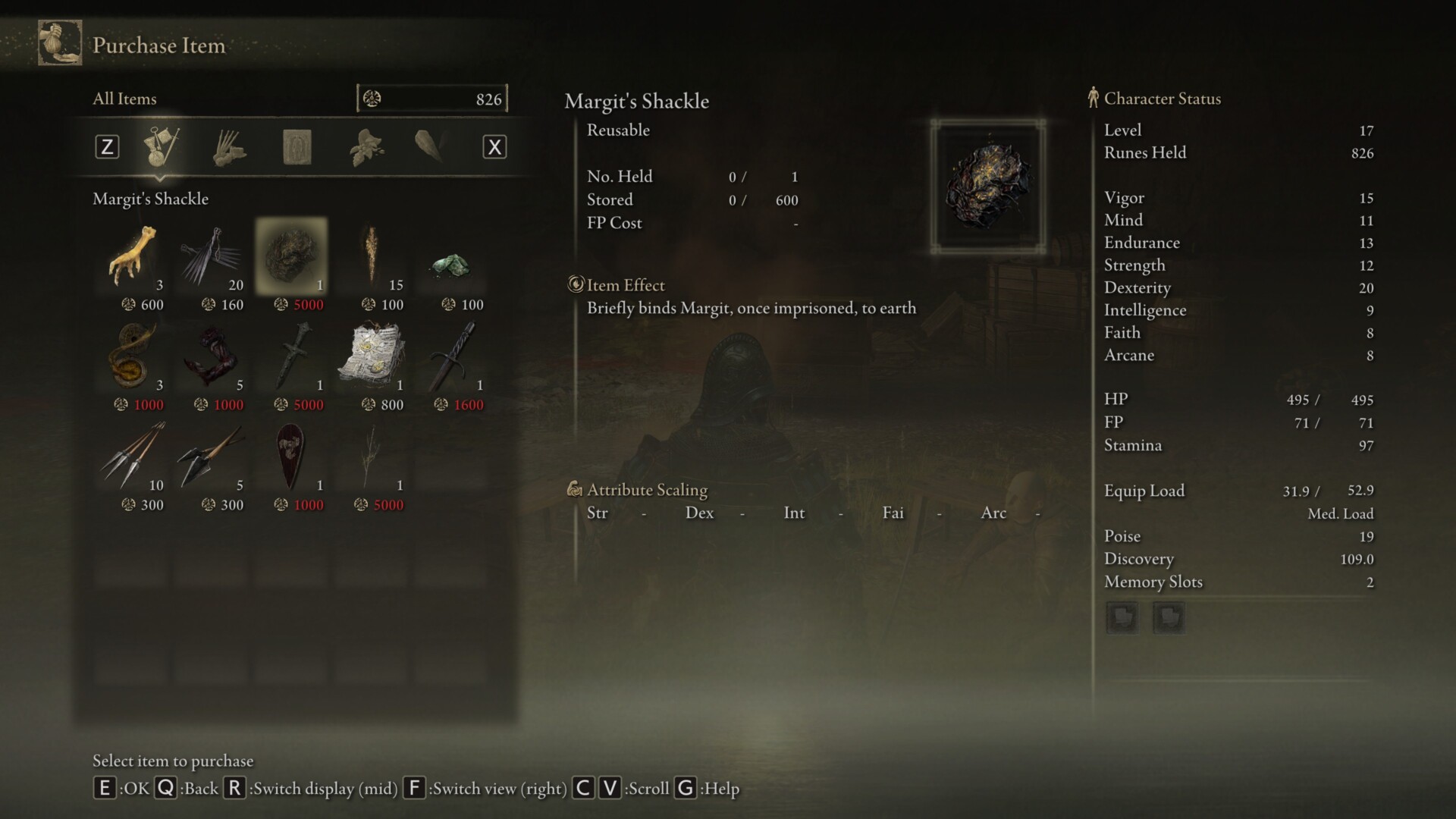 If you want to buy stuff from Patches, go ahead and look at his wares. The most crucial one, arguably, is Margit’s Shackle, which costs 5,000 runes. You can take a look at our rune farming guide if you need help amassing the currency.