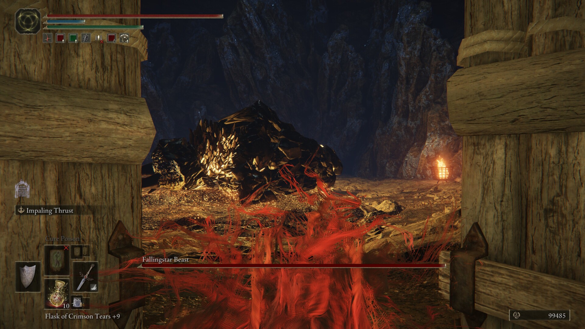 From there, you’ll emerge at the topmost section of the cave. This takes you to the boss’ arena where you’ll fight a Full-Grown Fallingstar Beast (the same creature you battled on the way to Mount Gelmir). The difference is that this is an enclosed space, and you won’t have Torrent with you. Still, it shouldn’t be a tough fight since the boss’ attacks can be telegraphed.