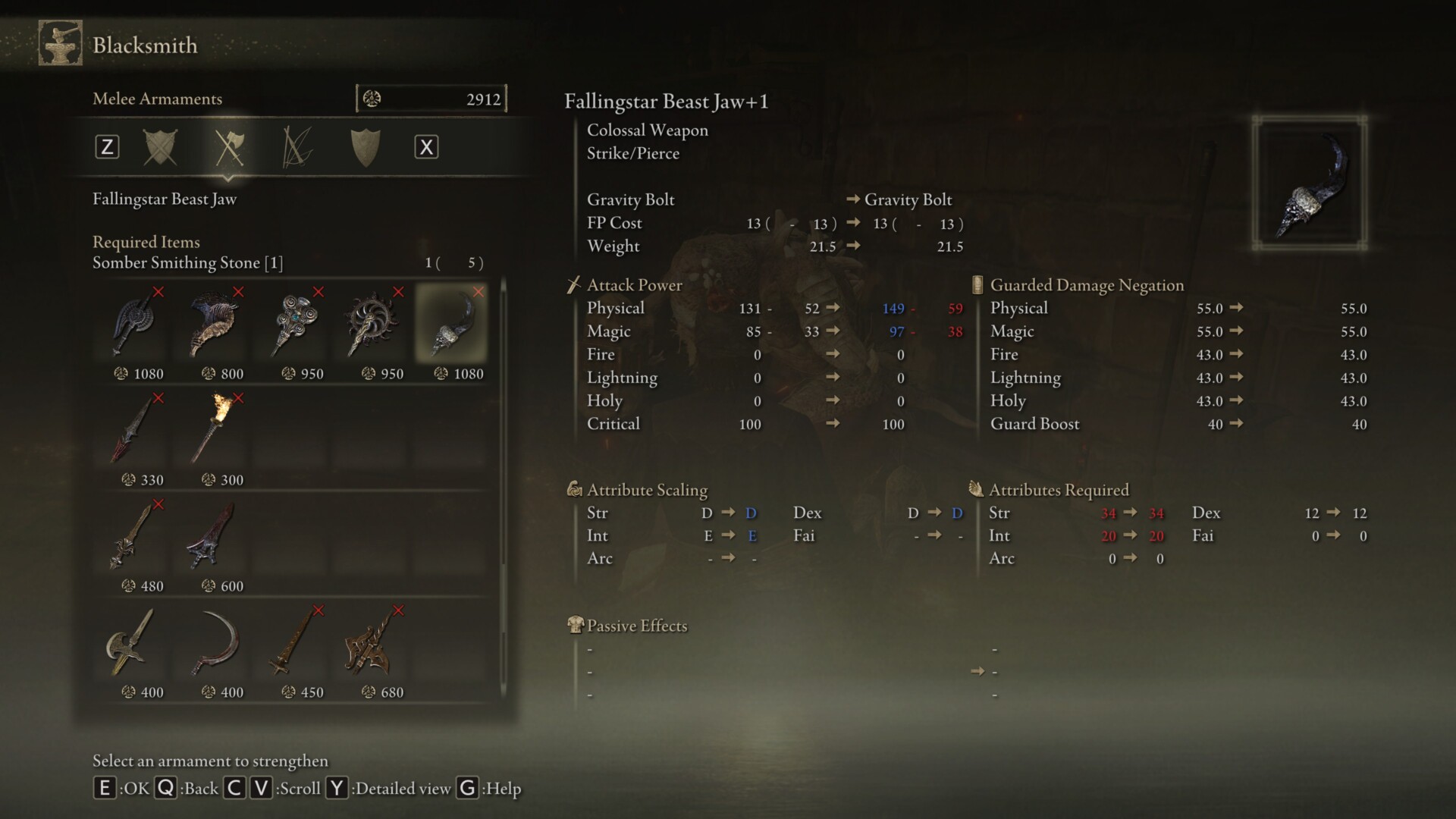 - Somber Smithing Stones – However, there are those with more unique names, and these require Somber Smithing Stones. If a weapon seems like it was once in a character’s possession, it dropped from a boss, it has a special skill, or it’s more thematic, then it’ll likely need Somber Smithing Stones instead. Examples include Ghiza’s Wheel, Serpent Hunter, Rosus’ Axe, and Fallingstar Beast Jaw.