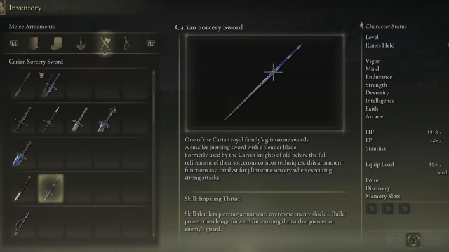 Not only does it come with a great weapon skill, but the Carian Sorcery Sword also acts as a catalyst for Glinstone Sorcery when executing strong attacks. In other words, you can use this weapon as a staff, and removes the need to equip one in your offhand.