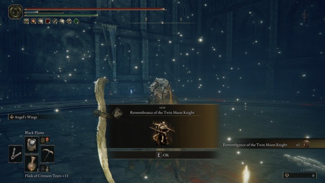 Once you finally defeat Renalla, she’ll drop Remembrance of the Twin Moon Knight which you can duplicate. You can exchange for one of these two rewards: